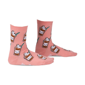 A soft peachy-pink color covers these socks, patterned with cartoon coffee drinks that have adorable cat faces. Each "Cat-puccino" is topped with a fluffy swirl of whipped cream, has little pointed cat ears, and a bright green straw. The cat faces feature sweet, closed eyes and rosy cheeks. Tiny scattered coffee beans are visible on the foot of the socks, adding to the coffee shop theme. On the bottom of one sock, a fun phrase is shown: "I DON'T GIVE A FRAPPE," surrounded by more coffee beans and a starburst design. It's a fun way to wear your love for cats and coffee.