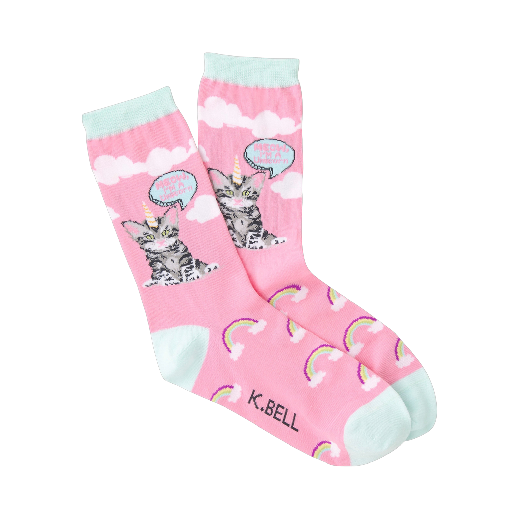 Chase the rainbow and bat it around the room with your two front paws! This pair of cute socks will have you magically purring with excitement. Each fun pink crew sock features a print of little rainbows, fluffy clouds, and a kitten with a unicorn horn saying "Meow, I'm a Unicorn"