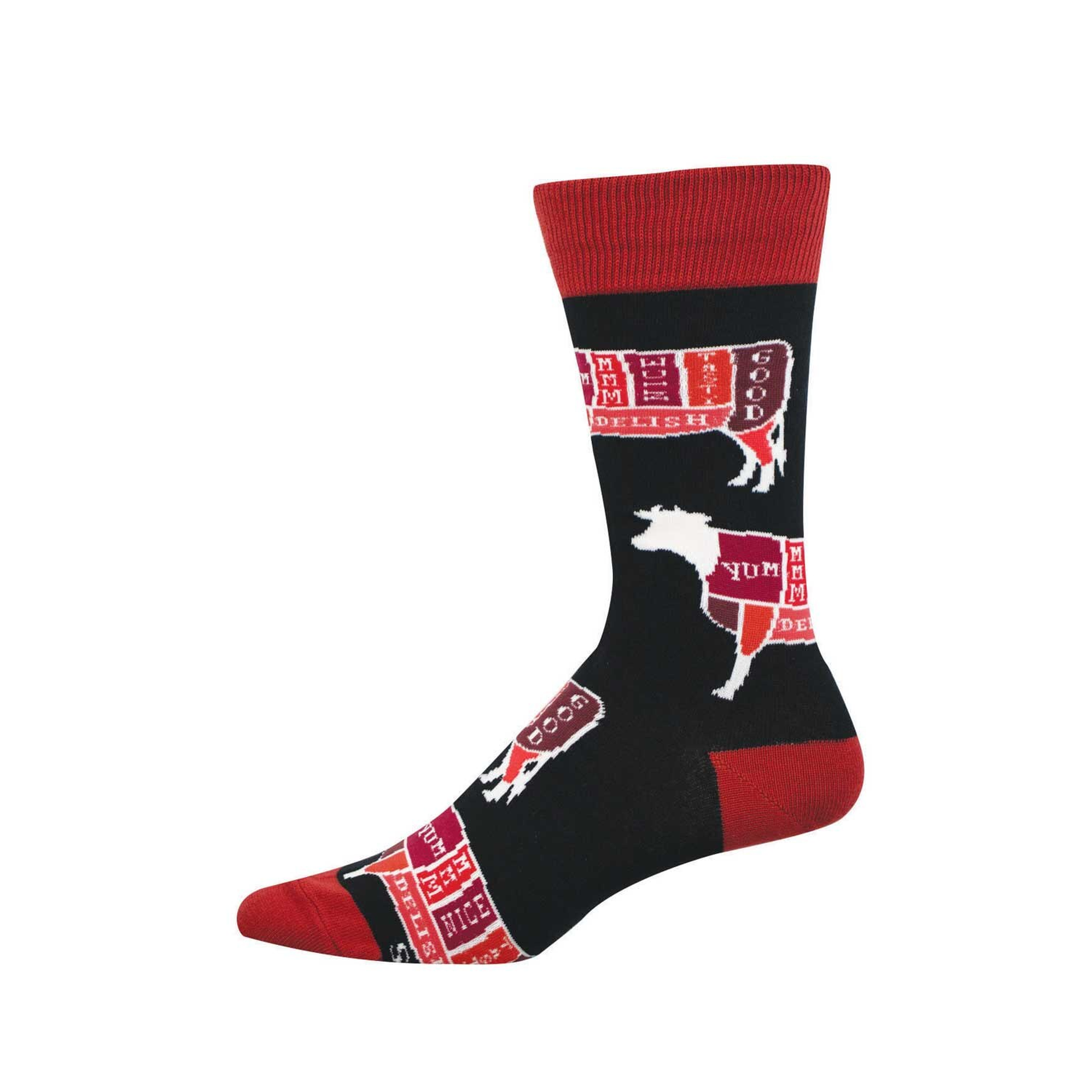 Because the artwork wraps around a classic crew silhouette, these socks bring personality to jeans, work pants, chinos, or even a more tailored look that could use a smart little wink. The red cuff, heel, and toe give the pair a clean finish, while the illustrated cattle cuts keep things lively from top to bottom. For men who like novelty socks with a strong graphic idea, these are easy to wear and hard to ignore.