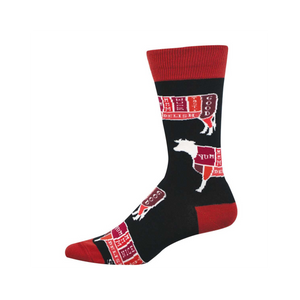 Men's crew socks with a butcher-shop twist, these are for anyone who appreciates a clever graphic and a little culinary swagger. The design lays out cattle cuts like a vintage meat counter diagram, with bold labels and a crisp, orderly layout that reads instantly from a distance and gets better the closer you look. The result is playful without feeling goofy, the kind of pattern that earns a second glance at the office, at dinner, or anywhere a good conversation might happen.