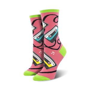 Life's too short to wear boring socks. Make a fashion statement with these retro Cassette Tape socks! Party like it's the 80's in this funky pair of pink crew socks with rad blue, green, and yellow cassette tapes and playful musical notes. These exceptional accessories aren't just comfy foot warmers, they're total conversation starters! Cassette Tapes socks, with you, forever.