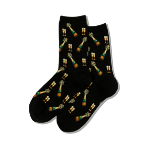 Pop the champagne and get ready to celebrate with these bubbly Champagne Bottles socks in a crew length. These black socks feature a dazzling pattern sparkling green champagne bottles and gold champagne flutes, making them the perfect accessory for any wedding or festive occasion. Slip into a pair and let the good times flow!