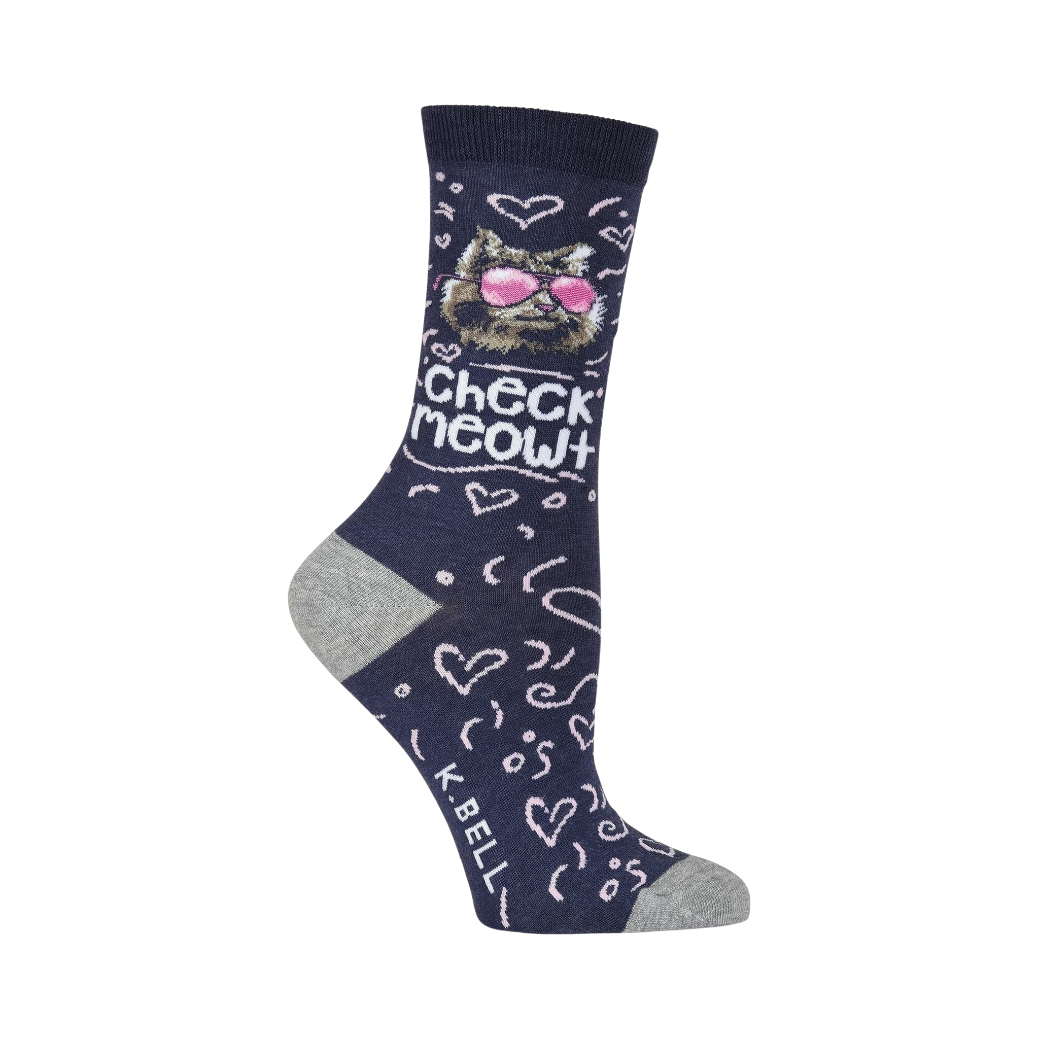 When you are a cool cat, people can't help but notice. Wear these purrfectly silly socks to let them all know you're the cat's meow! Each fun pair of gray and navy crew socks features a sketched heart print in pink with a super awesome cat wearing shades above the ankle. It ain't easy being purrfect.