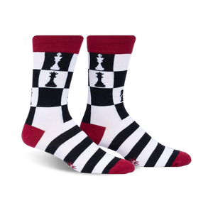 The chess king reigns supreme on these cool Check Yeah men's crew socks. Mixing black, white, and red, the pattern of chessboards and chess kings makes these socks striking to look at. The heel and toe are reinforced for durability. Perfect for a fun day of strategy on the board or to wear when you conquer your daily challenges.