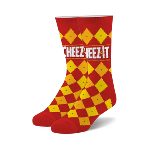 Stepping out for a fun day? Get ready to check out our red Checkerd Cheez It Fuzzy socks with yellow and orange squares. Crispy and delicious, Cheez Its never looked so good on your feet so you may not want to eat them! Show your love for the iconic cheesy cracker with these fuzzy, crew-length socks that are perfect for both men and women.
