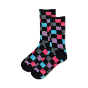 Checkers Non-Skid Crew Socks for Women: These checkered socks bring the fun of a classic board game to your feet in lively pink, blue, purple, and gray squares. Stay steady with non-skid soles, and embrace the quirky charm of these crew socks made for the modern-day fashionista.