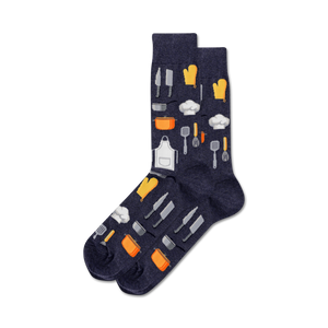 Indulge your senses in the culinary charm of our Chef socks! These dapper dark blue socks are a gastronomic delight, adorned with a playful medley of kitchen tools, pots, pans, spatulas, and an iconic chef's hat. Say goodbye to mundane sock choices and slide into a pair of these socks for a high-fashion culinary adventure. Whip up a storm in the kitchen or flaunt your impeccable style to amaze your pals. Crafted in crew length, these socks for men are a scrumptious treat for your feet, adding a pinch of flavor to your wardrobe and a grin to your face. Get ready to tantalize taste buds and turn heads with Chef socks! ?????