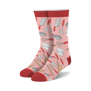 Chef socks! Cook up a storm with these crew length socks for women featuring fun patterns of chef hats, spatulas, rolling pins, meat cleavers, whisks, and frying pans in bright colors. A delightful way to add some flavor to your everyday wear!