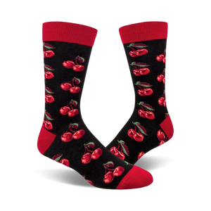 Cherries No Frills: These cherry-licious socks are a burst of juicy flavor for your feet! With a repeating pattern of plump, red cherries on a black background and a bright red top, these socks are sure to turn heads. Who says socks can't serve extra fruit?! They're like a sweet treat for your toes!
