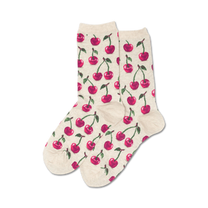 These cherry-licious crew socks are the sweetest way to add a pop of fun to your feet. With a vibrant pattern of red cherries against a black background, they're sure to turn heads wherever you go. Perfect for days when you need a little pick-me-up or just want to add some cheer to your outfit, these socks will have you feeling fruity and fabulous! So slip on a pair and let the cherry vibes take over!