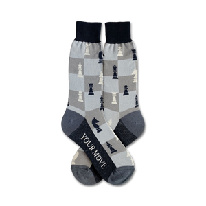 Calling all chess enthusiasts! Get ready to make your next move in style with these "Your Move" chess-themed socks. Featuring a playful pattern of black and white checkered squares, adorned with iconic chess pieces like pawns, rooks, bishops, knights, queens, and kings, these socks are sure to add a touch of strategic flair to your wardrobe. Whether you're a seasoned player or a casual fan, let these socks remind you that life's challenges are just like a game of chess - it's all about strategy and making the right moves. Put on a pair of "Your Move" socks and let the world know you're ready for the next challenge!