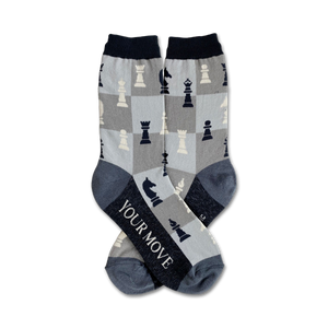 Checkmate! Your next move in the fashion game is a pair of these cozy gray crew socks with a chessboard pattern. The words "YOUR MOVE" at the bottom of the left sock will have your opponents thinking twice before making their next move. These socks are perfect for any chess enthusiast, casual gamer, or anyone who loves a fun and unique pair of socks.