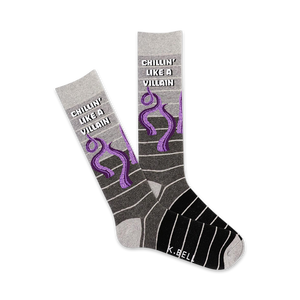 Calling all villains! Throw these 'Chillin' Like a Villain' socks on for the next caper. Stare down your arch nemesis without even breaking a sweat! These gray and black stripy crew socks with a purple octopus have the right balance of villainy and vibrancy. Who says you can't be a villain and have a little fun? Nobody.