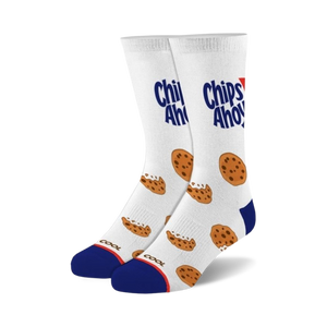 Chip Ahoy Crumbs Novelty Crew Socks for Men and Women: Our chip-tastic socks are the perfect way to satisfy your sweet tooth and your feet! With their comfy, chocolate chip cookie print, they'll have you craving a cookie (or two) in no time. Wear them proudly knowing they're as durable as your favorite chocolate chip cookie - maybe even more!