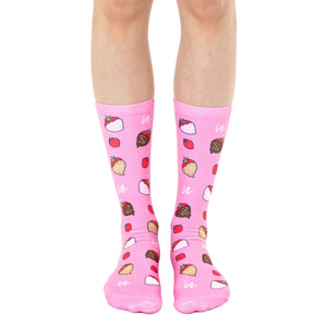 Chocolate Strawberries: Your feet deserve a sweet treat! Our Chocolate Strawberries socks are just what the fashion doctor ordered, with a vibrant pink background and a pattern of plump strawberries dipped in rich chocolate. These crew-length socks for women are not only tasty to look at, they're also super comfy and made from premium materials to keep your feet feeling oh-so-scrumptious. Like a box of chocolates, you'll never know what design you'll get. So treat your feet and indulge in a delicious fashion moment with our Chocolate Strawberries socks.