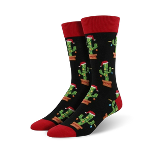 Christmas spirit in full bloom! These crew lenth men's socks feature a pattern of Christmas cacti wearing red Santa hats and adorned with multi-colored Christmas lights, all nestled in cozy tan pots and red saucers. Show off your festive side while embracing the holiday cheer no matter where you go!