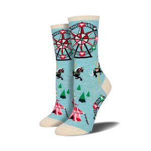Christmas Fair Womens Crew Socks are festive, jolly, and ready to brighten up your day! These blue socks feature a colorful pattern that will definitely make you feel merry and bright. Carousel horses, Christmas trees, and presents will have you feeling the Christmas spirit from head to toe. It's like wearing a tiny, festive party on your feet. These socks are the perfect addition to any holiday outfit, and they're sure to put a smile on your face every time you wear them.