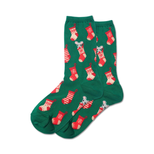 Christmas stocking mouse socks! These crew length women's socks are sure to bring some holiday cheer to your feet. The dark green socks feature a pattern of red and white stockings, each with a gray mouse peeking out. These socks are perfect for keeping your toes warm and cozy all winter long. They also make a great gift for any Christmas lover in your life. Fun fact: Did you know that mice can squeeze through holes as small as a dime?