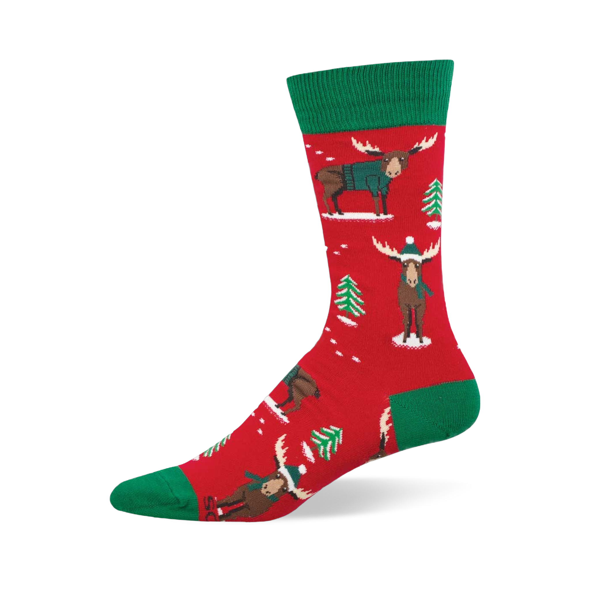 Meet a pair of men's crew socks that bring winter woods charm to the season without taking themselves too seriously. The moose are the stars here, dressed for cold weather in sweaters, scarves, and festive hats, scattered across a classic holiday scene with a little snowy detail and plenty of personality. It has the kind of look that feels familiar at a glance, then gets better the longer you stare at it.