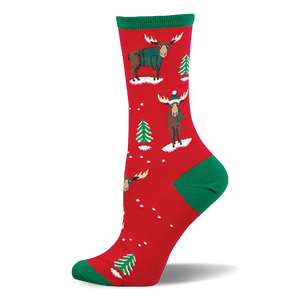 Celebrate the season with our whimsical Christmoose design! Picture cheerful moose sporting cozy teal sweaters and matching beanies, surrounded by festive green Christmas trees and pristine white snow. Perfect for holiday lovers who appreciate a quirky twist on seasonal style, these socks bring joy and laughter to your sock drawer. Spread Christmas cheer with every step!