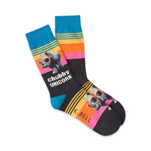 Chubby unicorns wearing sunglasses. Rock these crew length unicorn socks for men, perfect for any occasion. Take a magical journey with these vividly colorful socks showcasing chubby, sunglass-wearing unicorns that will have you feeling fantastical. Strut your stuff in these socks with the bold words "Chubby Unicorn" proudly displayed, reminding you to embrace your inner magic.