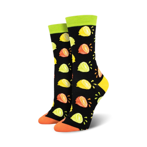 Squeeze some zing into your sock game with our Citrus Squeeze Bamboo Crew Socks! These sweet kicks are bursting with juicy lemons, limes, and oranges on a black canvas, finished with a cheerful green cuff and a zesty orange toe. Get ready to add a refreshing pop to your everyday style!