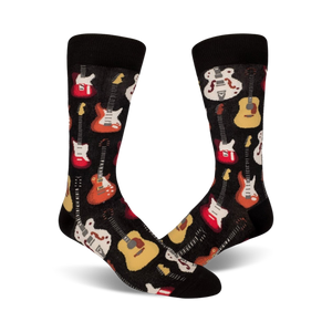 Music to your toes! These black crew socks for men feature a vibrant pattern of electric and acoustic guitars, perfect for any music lover. Rock out in style and show off your passion for all things musical. Whether you're a guitar player, a fan of live music, or just love to listen to your favorite tunes, these socks will have you feeling like a rockstar.