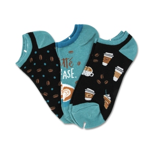 Feeling a latte down? Grab a cup of joe and caffeinate your feet with this 3-pack of fun black, blue and teal ankle socks! Adorned with a lively pattern of coffee cups, coffee beans, and the life-affirming words "latte" and "case," these socks will surely perk up your step and add a touch of whimsy to your day. Because why should your caffeine addiction be limited to your tastebuds when your feet can join in on the fun too?
