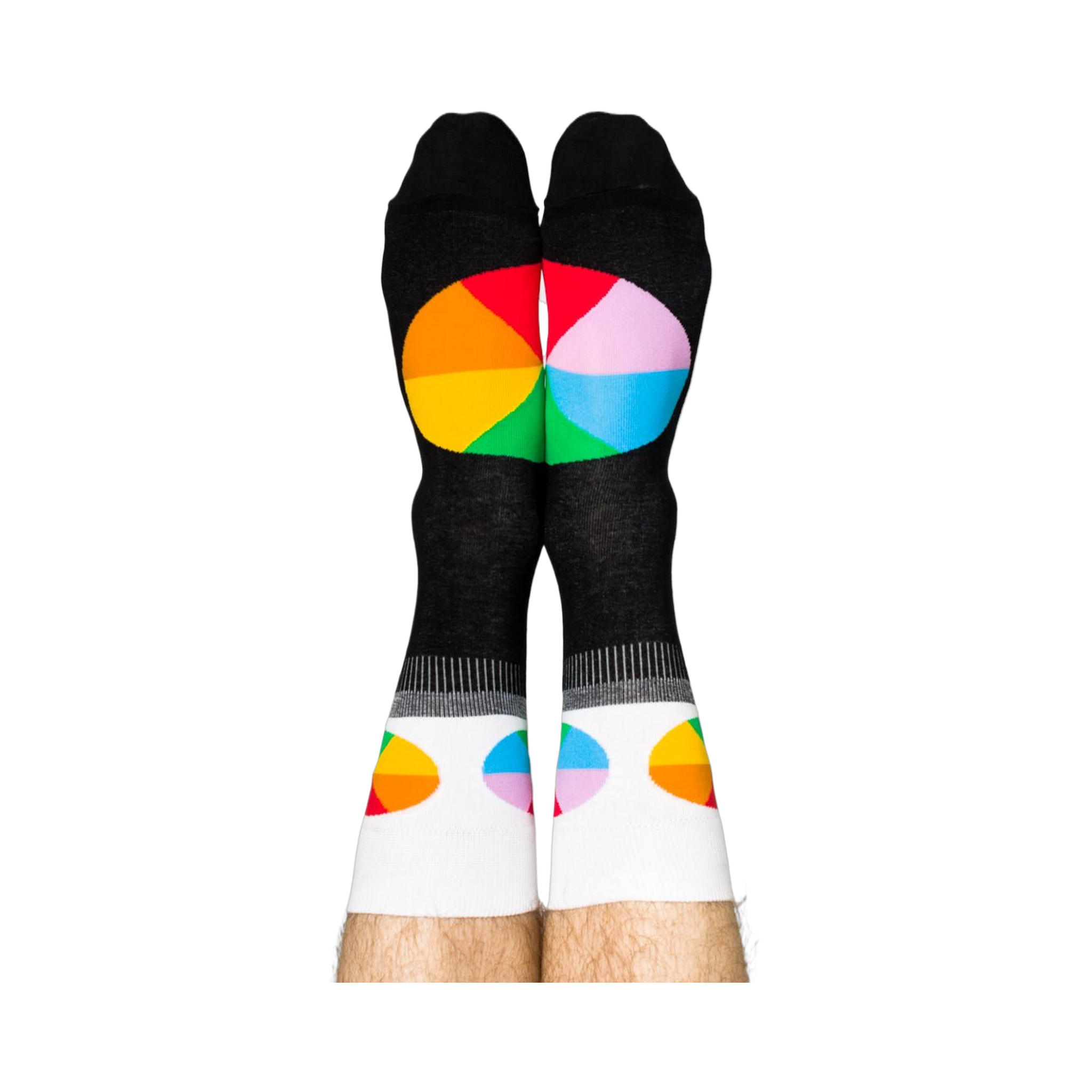 These men’s crew socks take a simple idea and give it a crisp, graphic turn. The color wheel motif lands with the clarity of a design tool or a classroom chart, but it feels more playful than purely practical. The contrast between the bold circular pattern and the darker foot makes the colors stand out in a sharp, easy-to-wear way.