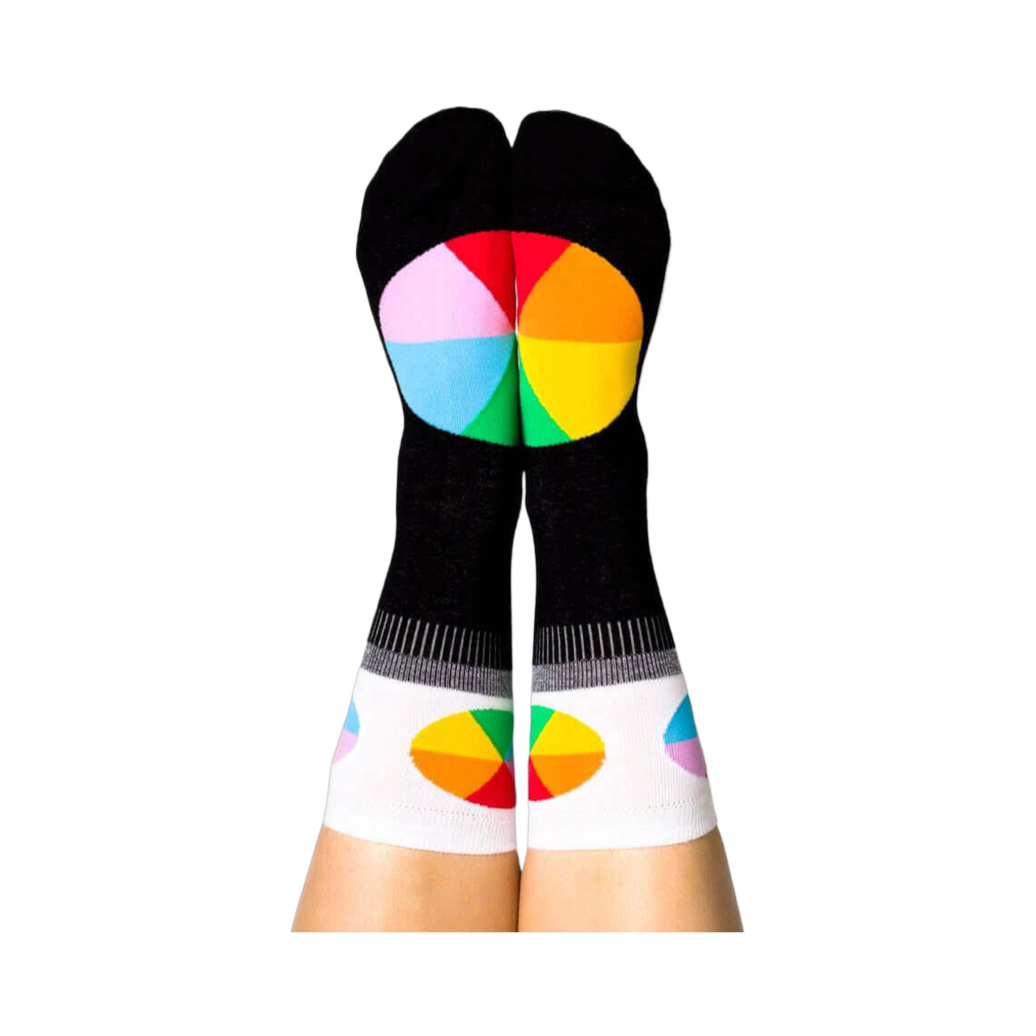 Color Wheel socks turn the foot into a clean graphic canvas, with bold circular bursts that feel part art class, part modern poster design. The crisp contrast and segmented rainbow palette give these women's crew socks an instant point of view without crowding the rest of an outfit. They have the sort of pattern that makes people look twice, then ask where you found them.