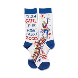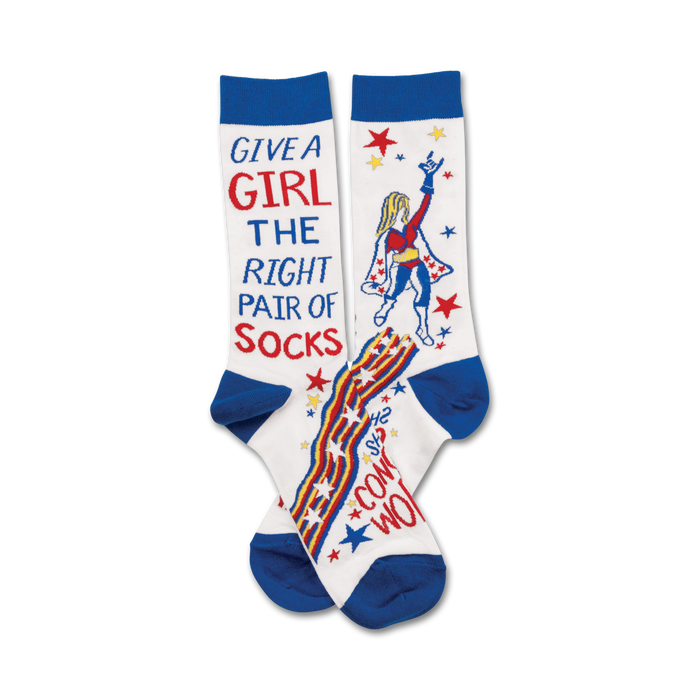 Get ready for a world-conquering fashion statement! Slip into these white crew socks with blue toes, heels, and tops and let the inspirational words 'Give a girl the right pair of socks...She can conquer the world' inspire you. Featuring a superhero girl graphic, stars, and the words 'Conquer the World,' these socks are the perfect pick-me-up for any woman ready to take on the day. They're even made for women like you who like to save the world, one step at a time.