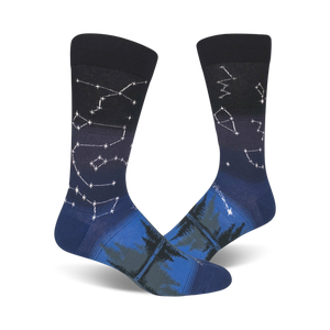 Blast off into a cosmic adventure with these out-of-this-world constellation socks! Get lost in the mesmerizing blues of the night sky as starlight dances across your feet. With evergreen trees standing tall, you'll feel like you're strolling through galaxies. Explore the wonders of the universe, one sock at a time.