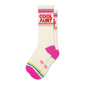A pretty official badge for the 'Cool Aunt' in your life, or maybe just for you. These socks give off that perfect retro vibe on an off-white base, featuring 'COOL AUNT' spelled out in bold red letters down the side. The bright pink on the toe and a chunky pink stripe on the cuff really pops, joined by thin green and yellow stripes for an extra splash of color. There's a bit of flair with those two small red symbols visible on the foot. Slip these on when you're ready to show off your top-tier aunt status, or just want some comfy, colorful socks for hanging out.