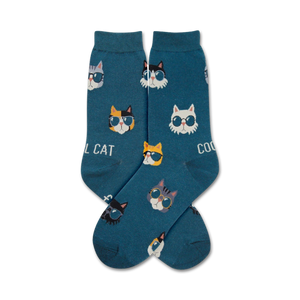 Cool cats in shades to turn heads and make paws. These blue crew socks feature a pattern of cartoon cats rocking sunglasses and the words 'Cool Cat' in a repeating pattern. Perfect for cat-loving ladies looking to add some fun and whimsy to their sock drawer!