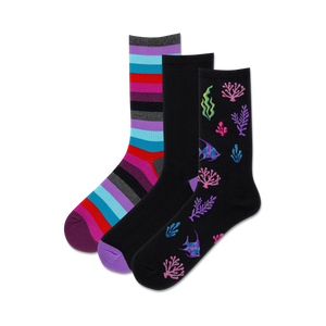 Dive into the Coral Reef with our Check 3Pack of Socks! Experience the beauty of the underwater world with three vibrant designs featuring coral and tropical fish. The black base with thin red stripes and a purple toe and heel adds a pop of color. The black socks with purple, blue, and red horizontal stripes add a touch of fun. Ready to take the plunge? Grab a pair of Coral Reef socks and make a splash!