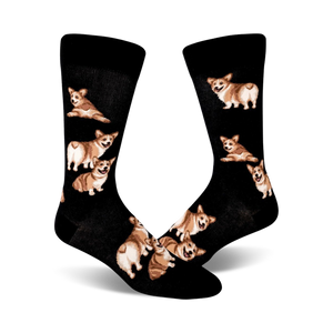 Strut your fluffy butt in these Corgi Butt Strut socks! Featuring a colorful pattern of cartoon corgis doing a butt wiggle, these black crew socks are sure to bring a smile to your face. They're paw-some for men who love their dogs and want to show off their sense of humor. Fun fact: Corgis are known for their big personalities and "talking" habit. Rock these socks and prepare for the tail wags and belly rubs!