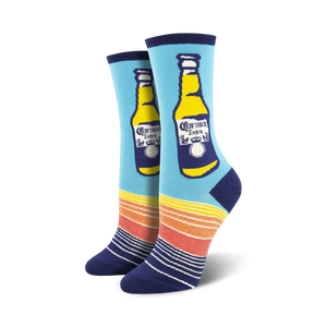 Crack open a cold one with these Corona Summer crew socks! These fun socks showcase a lively pattern of Corona beer bottles with yellow, orange, and red striped detailing at the cuff and toe. Who says beers and socks don't go together? Talk about a refreshing time!