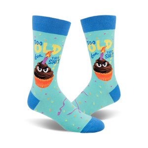Crappy Birthday socks: When birthdays become a bummer, the socks keep things humorous. Blue at the top, these socks declare 'Too Old for This Shit' below a solitary cupcake with candle. These crew-length, men's socks are a fun reminder that life doesn't stop being hilarious, it just changes with age.
