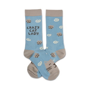 A cat lady's world is filled with fuzzy felines, warm purrs, and the occasional scratching post. Show off your crazy cat lady pride with these blue crew socks that feature the words "Crazy Cat Lady" and playful cartoon cat faces. These socks are purr-fect for any cat lover who's not afraid to show their love for their furry friends. Plus, they're sure to make you smile every time you wear them.