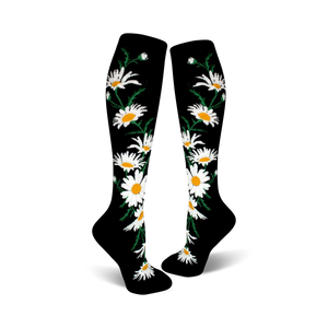 Show off your wild side with these Crazy for Daisies knee-high socks! With bright yellow and white blooms bursting out of a field of chic black, you'll have a blooming good time wherever you go. It's a fact - wearing these socks will make you so happy, you'll sprout green stems and leaves!