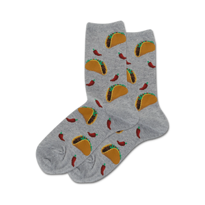 It isn't surprising why everyone loves tacos. They can be eaten in so many ways and loaded with tons of tasty toppings. If you are an avid taco eater, these cool women's novelty socks belong in your sock drawer! Each funny pair of socks feature crispy shelled tacos and hot peppers printed all over on a gray background. Now you don't have to wait until Tuesday to enjoy your tacos!