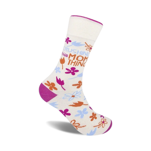 Rock 'Crushing This Mom Thing' socks, and show the world you're a total mom boss! With a vibrant purple toe and heel and playful florals, these white crew socks are a sassy declaration of your multitasking prowess. Show off your mom game while crushing life's challenges with these confident and comfortable socks.