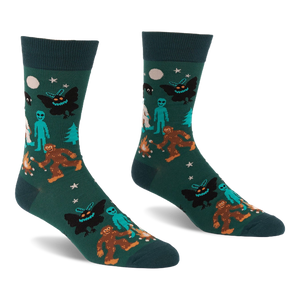 You've stumbled upon the secret meeting spot for all the mysterious creatures of the night. These socks are a deep forest green, like a shadowy woodland, and they're packed with a whole society of cryptids just hanging out. You'll see Bigfoot stomping around, a cool teal alien waving hello, and the Mothman with its big black wings and red eyes. There's also a fuzzy white Yeti visible, chilling near a little campfire. Teal pine trees and tiny white stars are scattered across the night sky, along with a pale moon and even a UFO. It's a full-on woodland party for legendary beasts, perfect for keeping your feet cozy while you ponder the unknown.