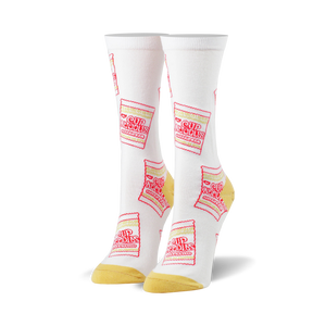 "Cup Noodles fanatics, embrace the taste of fun with our Cup Noodles Cup Crew Socks! These white socks feature an allover print of red and yellow Cup Noodles soup packages, complete with the iconic Cup Noodles logo. Just like the beloved instant noodles, these socks bring a burst of energy to your feet, keeping you comfy and stylish. Show off your love for Cup Noodles and your playful side with every step."