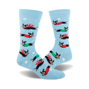 Winter is no match for the adventurous spirit of dachshunds, especially when they're decked out in their cozy gear and bounding through a snowy wonderland. These sky blue men's socks capture their playful energy, ensuring that even the chilliest days are warmed by their brave and loyal charm.