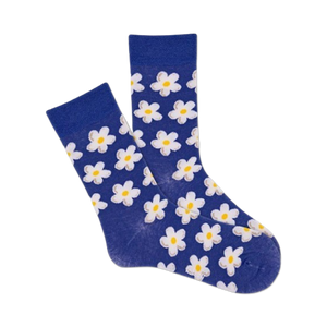 Blue skies and bright daisies, that's what Daisy Dot crew socks are all about! Walk on the wild side in these fun, light-blue crew socks with white polka dots. Show off your sassy self and give a little nod to the 60s flower power movement with the bright white daisy pattern that covers the entire sock. It's sure to add some cheer to your day!