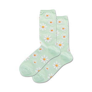 Put some "Pep" in your step! These Daisy crew socks will brighten your spirits with their verdant glow and yellow and white daisies! The energetic pattern will make you feel like you're prancing through a field of daisies on a warm summer's day! Perfect for that special sassy someone in your life!