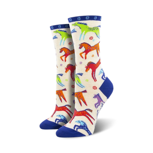 Giddyup with these prancing ponies! These socks are lively and full of energy, featuring a parade of colorful horses against a creamy backdrop. Watch as these majestic steeds gallop, leap, and prance their way across your feet. Perfect for the equestrian enthusiast or anyone who loves a touch of whimsy in their wardrobe, these Dancing Horses socks will add a spring to your step and a smile to your face.