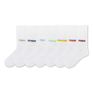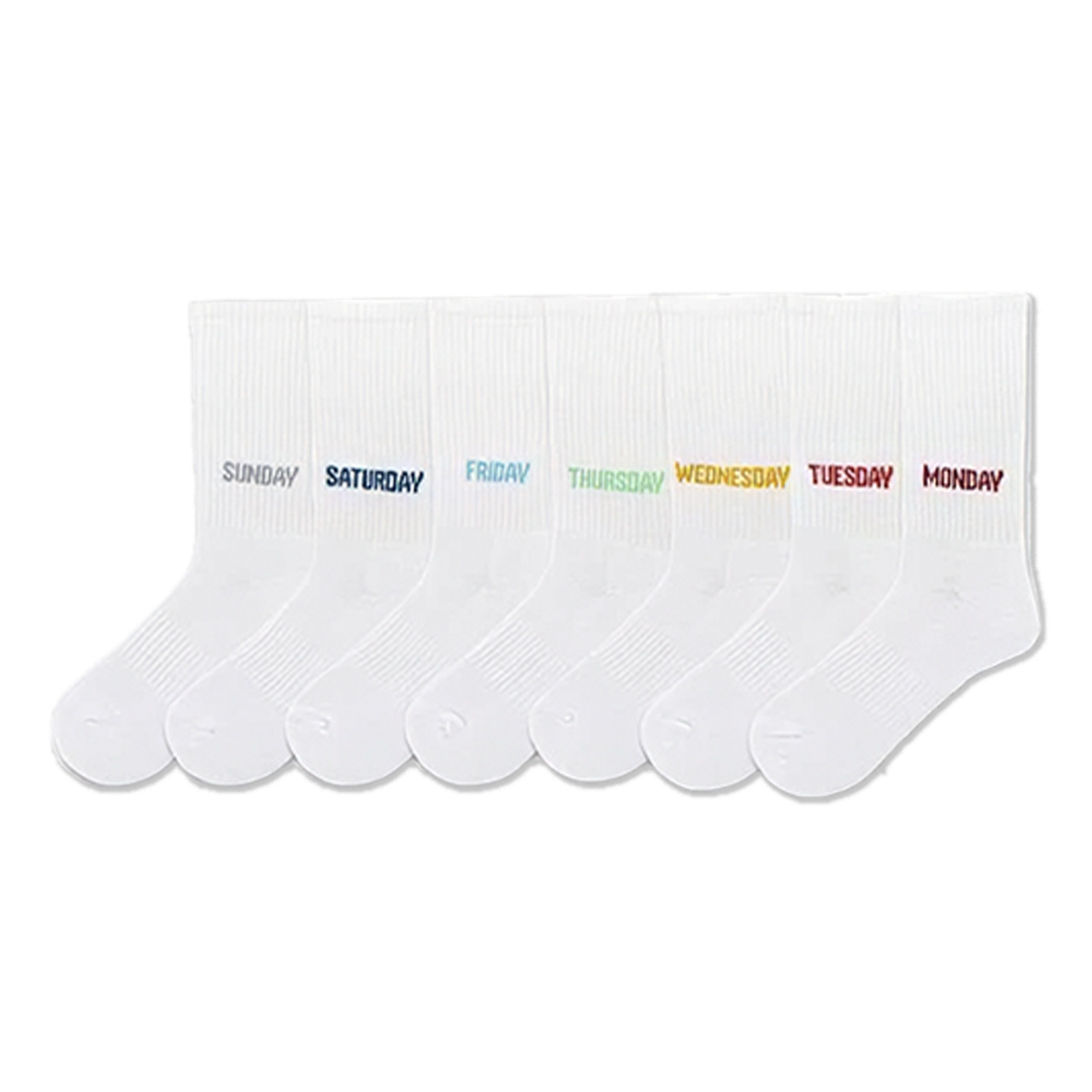 These socks are a hoot! Seven different colored and patterned crew socks to help you keep track of your week. Monday's got you feeling red like a firecracker, Tuesday's got you seeing red like a rose, bright and cheery yellow for Wednesday, Thursday you'll be feeling sage like the advice you're not taking, Friday's light blue skies ahead of you, Saturday, oh Saturday, you're navy blue because you made it to the weekend, and Sunday, well, Sunday you can be gray while you catch up on chores and rest up for the next days socks.