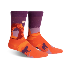 Get ready to trek through the desert in these Delicate Arch crew socks! Featuring a stunning design of a red rock formation under a moonlit sky, these socks are perfect for any outdoor enthusiast. Made for men, they're as rugged as the terrain they're inspired by. Whether you're hiking, camping, or just relaxing at home, these socks will keep your feet cozy and stylish.